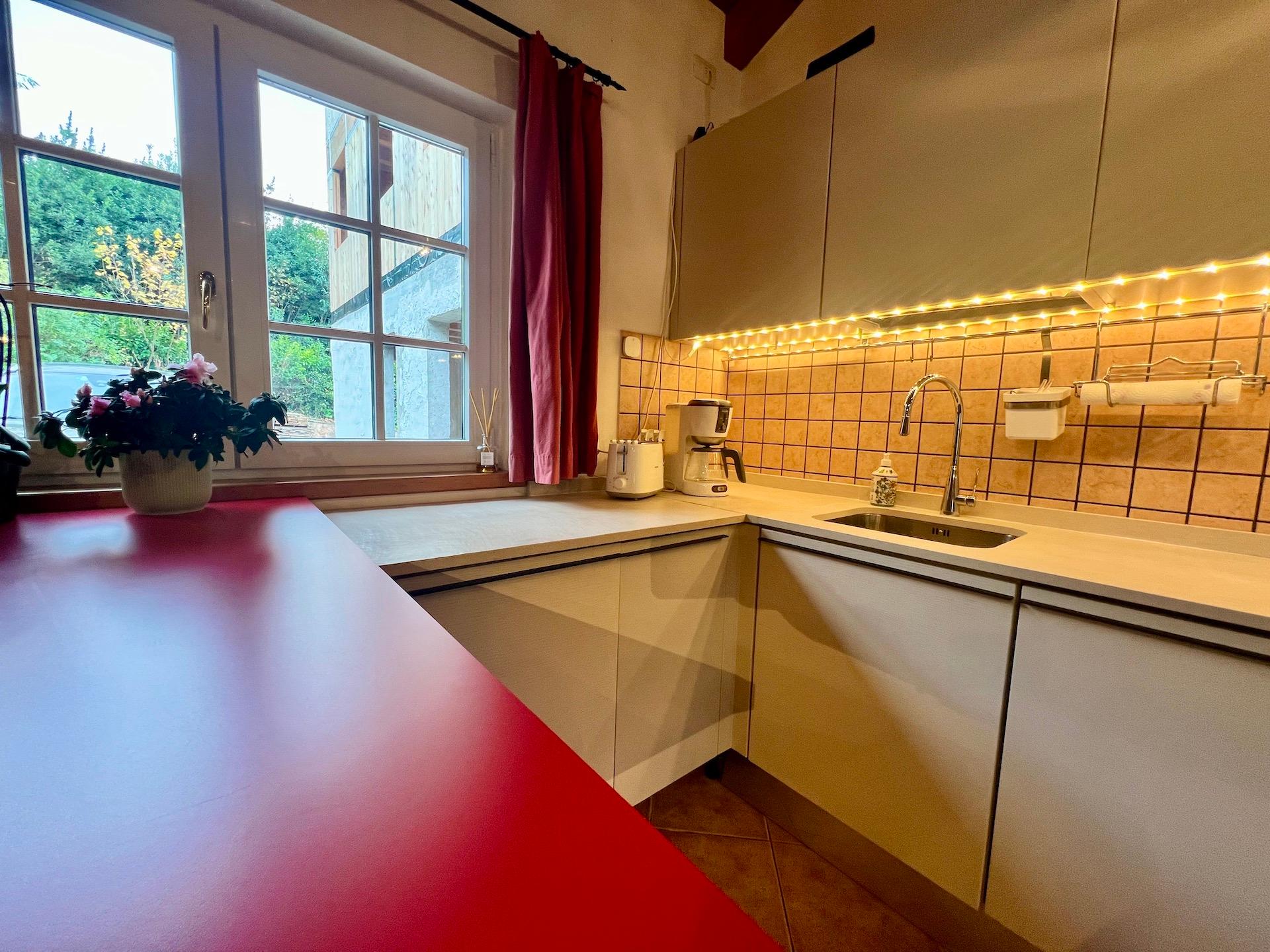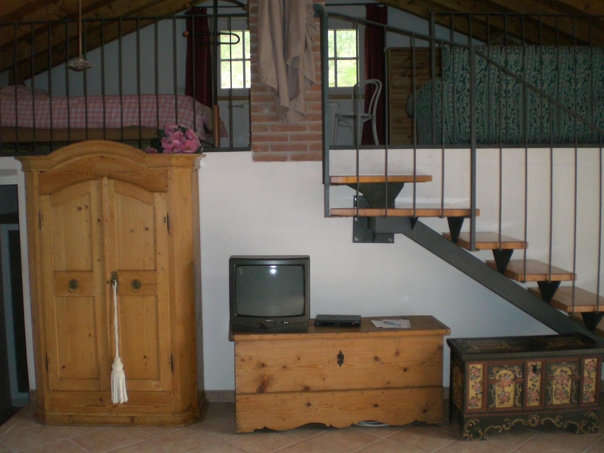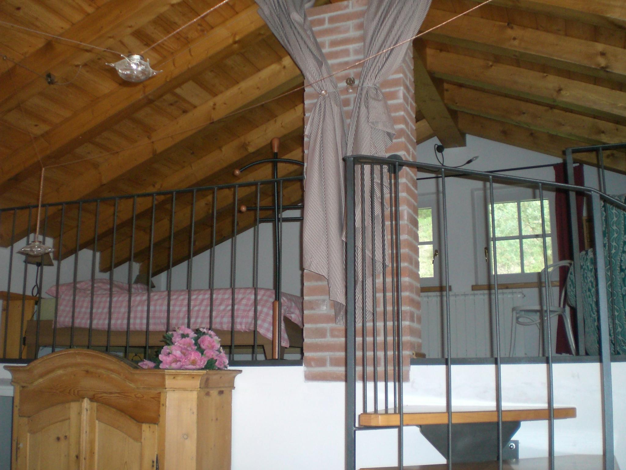 - Spazioso monolocale con soppalco: Dormi comodamente nel letto matrimoniale situato sul soppalco, sotto un caratteristico tetto in legno con travi a vista.